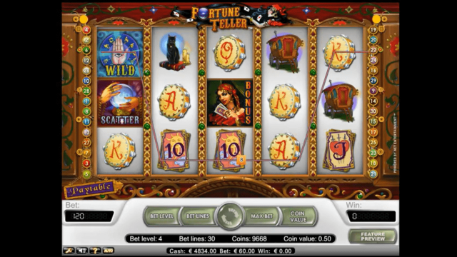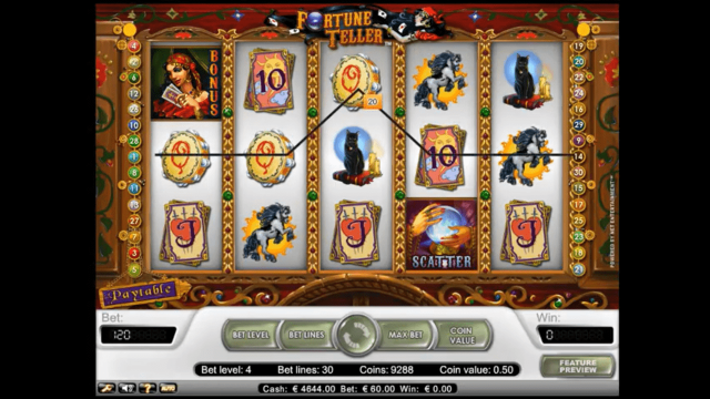 В игровом автомате Гадалка 5 активных барабанов, 30 рабочих линий, спецсимволы, бонусный раунд и автоплей. Диапазон ставки — от 1 до 5 монет, стоимостью от 1 до 50 центов. Выбрать размер ставки пользователь сможет самостоятельно. Новичкам стоит начинать с минимальной суммы.
